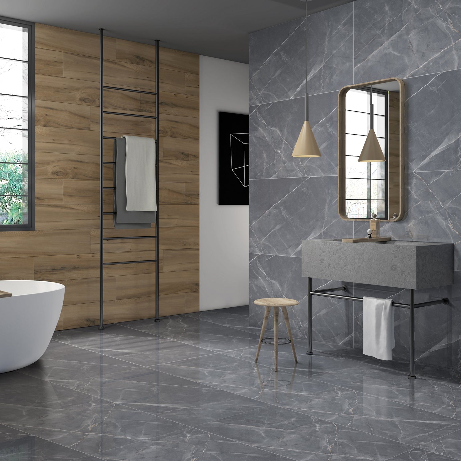 Raffiné et expressif, le carrelage 60x120 cm Leceister séduit par son fond gris anthracite profond, traversé de veinures blanches et légèrement dorées. Ce contraste subtil apporte relief et sophistication, tout en évoquant la noblesse d’un marbre naturel au style affirmé.