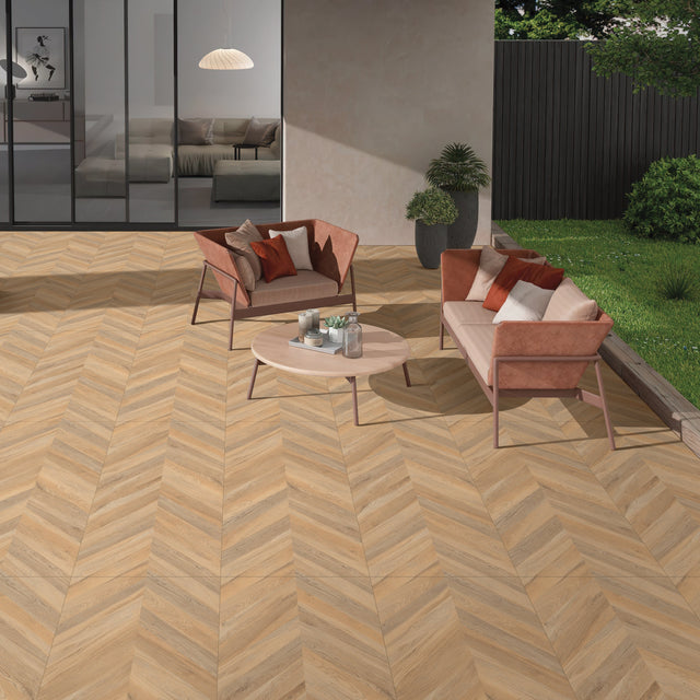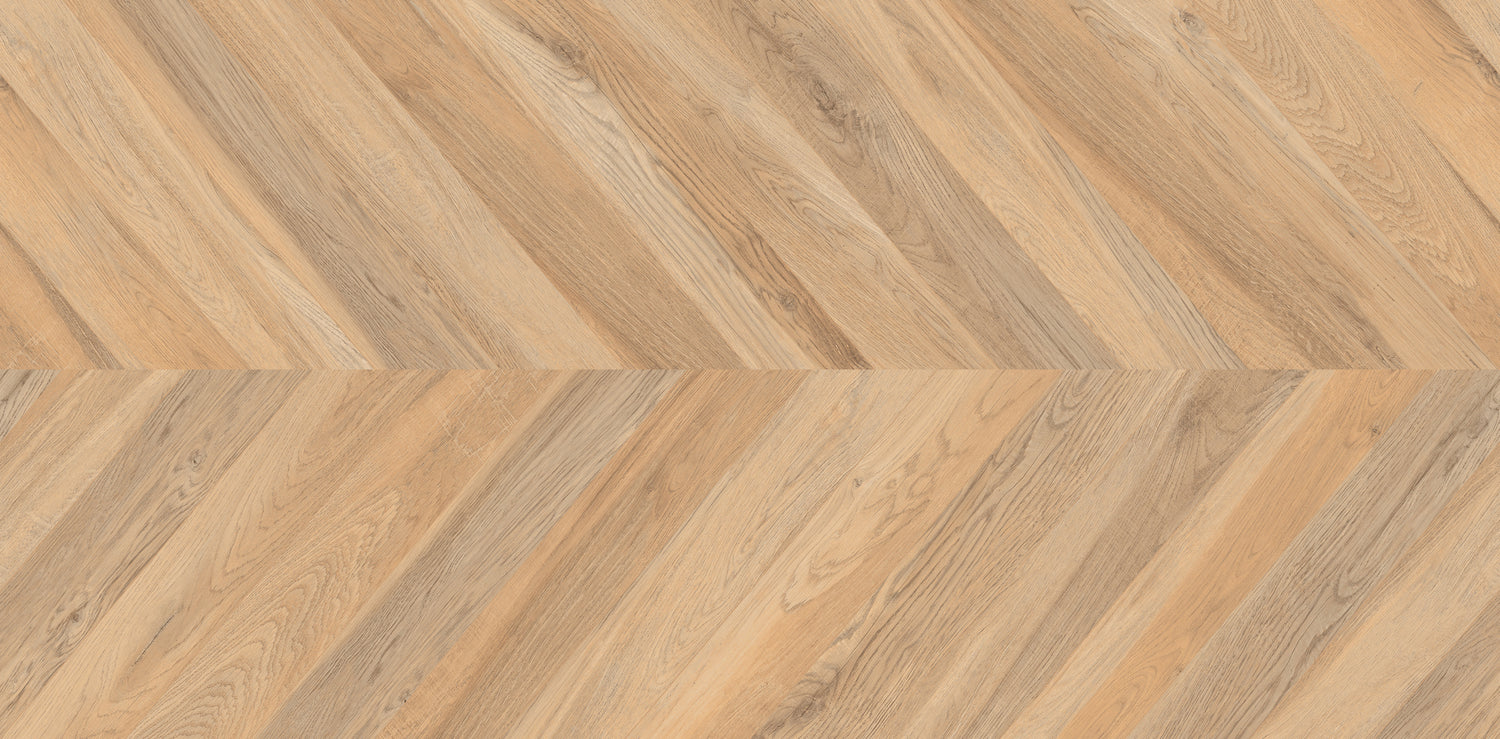 Le carrelage Tulip Wood, au format 60×120 cm, réinterprète avec audace le charme authentique du bois naturel à travers un motif en chevrons (point de Hongrie) intégré au carreau. Ses nuances de chêne doré et ses veinages réalistes apportent une chaleur organique et un rythme architectural unique à vos espaces, alliant le cachet du parquet à la résistance du grès cérame.