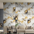 Le carrelage Bieon Lux, au format 60x120 cm, propose un effet marbre artistique inspiré de la technique du "Liquid Art". Son décor se caractérise par des volutes vaporeuses de blanc et de gris anthracite, rehaussées par des veines d'or éclatantes qui parcourent la surface.