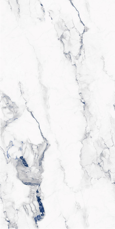 Le carrelage Imperial Blue, au format 60x120 cm, propose un effet marbre blanc d'une pureté absolue, sublimé par des veinages spectaculaires. Son décor se caractérise par des lignes de force d'un bleu impérial profond et des nuances grisées vaporeuses qui parcourent la surface, créant un jeu de relief visuel qui exalte le contraste saisissant entre la clarté du fond et l'intensité des veines.