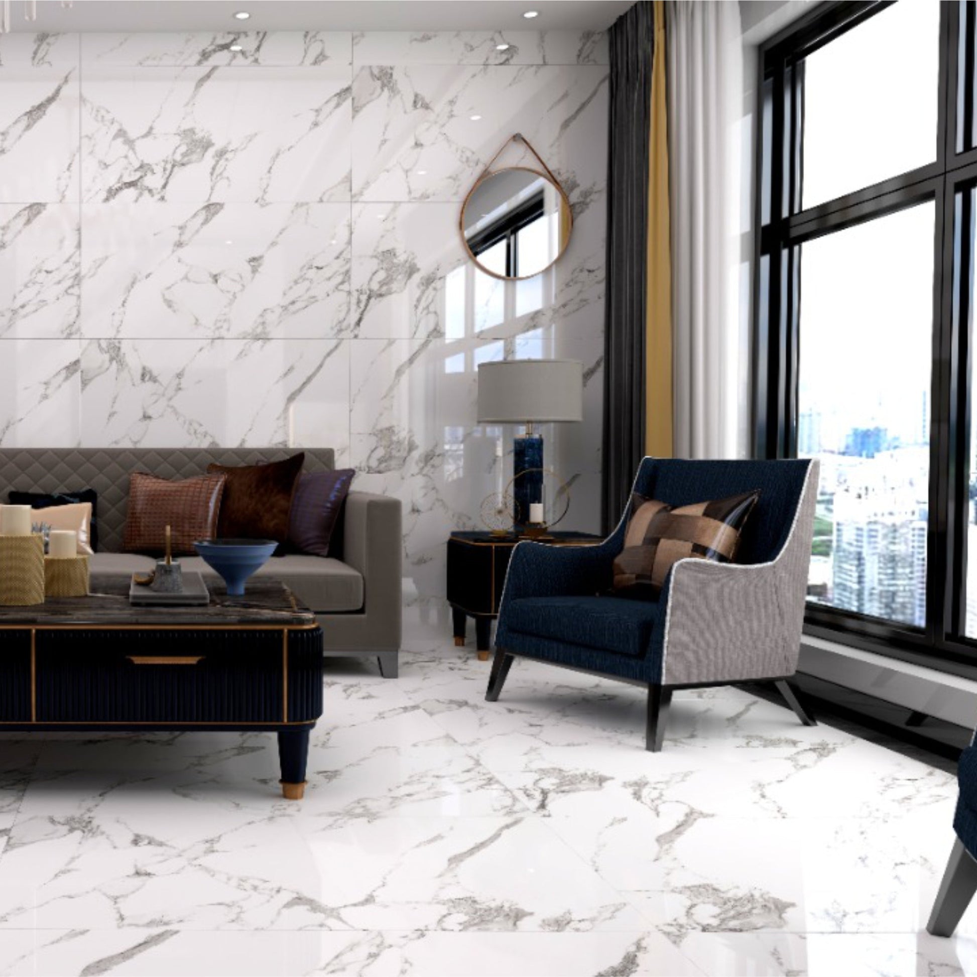 Le carrelage imitation marbre blanc, 60x120cm, combine l’intensité du marbre véritable et la praticité du grès cérame, alliant résistance, facilité d’entretien et style intemporel.